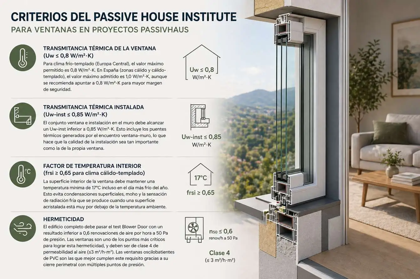 El Passive House Institute establece unos criterios concretos que las ventanas deben cumplir para ser aptas en un proyecto de casa pasiva. Estos son los parámetros fundamentales: